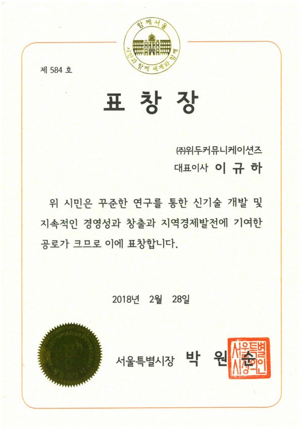서울특별시장 표창장 페이지 정보 작성자 WeDu 댓글 0건 조회 7,098회 작성일 19-05-30 19:35 본문 2018-02-28 표창장 제 584호 신기술 개발 및 지속적인 경영성 창출, 지역 경제 발전 기여 서울특별시장 박원순 List Previous2018 소년한국 우수 어린이 도서 19.05.30 Next서울클러스터 어워드 우수상 19.05.30