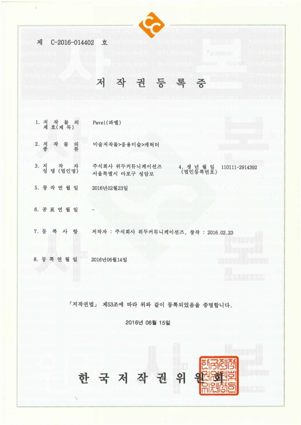 [한국/저작권] 파벨 페이지 정보 작성자 WeDu 댓글 0건 조회 6,490회 작성일 19-05-30 19:11 본문 2016-06-15 저작권 C-2016-014402 파벨 / 미술저작물>응용미술>캐릭터 List Previous[한국/저작권] 누미 19.05.30 Next[한국/저작권] 월터 19.05.30