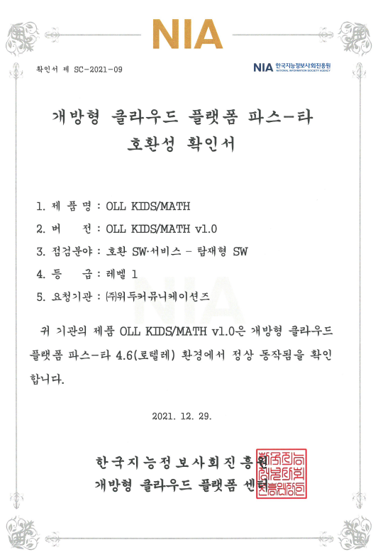 [한국/확인서] OLL KIDS/MATH 파스-타 호환성 확인서 페이지 정보 작성자 WeDu 댓글 0건 조회 10,857회 작성일 21-12-31 12:48 본문 2021-12-29 확인서 제 SC-2021-09 점검분야 : 호환 SW서비스 - 탑재형 SW List Next[한국/인증서] OLL KIDS/MATH 클라우드 서비스 확인서 21.12.31